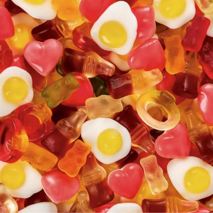 SORTIDO DE GULOSEIMAS / Ingredientes: Xarope de glicose; açúcar; água; gelatina; humidificante: xarope de sorbitol; dextrose; amido de milho; acidificante: ácido cítrico; sumo de frutos fabricado a partir de um produto concentrado: framboesa, maçã, laranja, limão, morango, ananás; gelificante: ágar-ágar; aroma; concentrados de frutos e plantas: groselha-negra, baga de sabugueiro, arónia, uva, rábano, maçã, cártamo, espirulina, kiwi, laranja, limão, manga, maracujá; extrato de baga de sabugueiro; xarope de caramelo; corantes: curcumina, azul patenteado V, carvão vegetal; agentes de revestimento: cera de abelhas (branca e amarela), cera de carnaúba. Pode conter vestígios de leite, trigo.